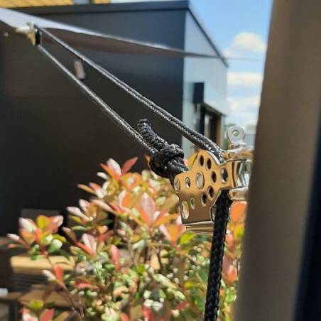 La cuerda náutica y las poleas de acero inoxidable garantizan una excelente resistencia a la tracción y a los riesgos climáticos. La cornamusa de las poleas bloquea la tensión de la cuerda y evita que se afloje.